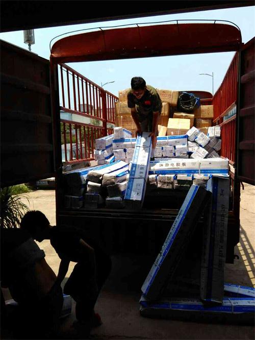 今日中午,烈日當空,一車亮光/亞光防靜電膠皮(規格1.2m*10m)抵達我司。