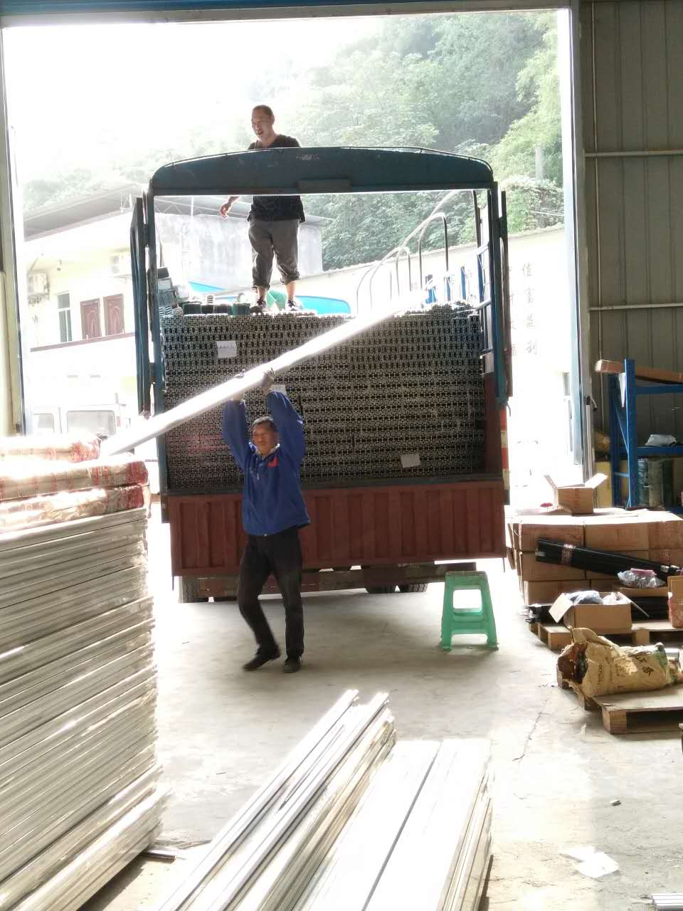 匯利興戰士齊心協力一同卸下鋁型材,滿大車的鋁型材轉間就轉移至倉庫。(團結就是力量)
