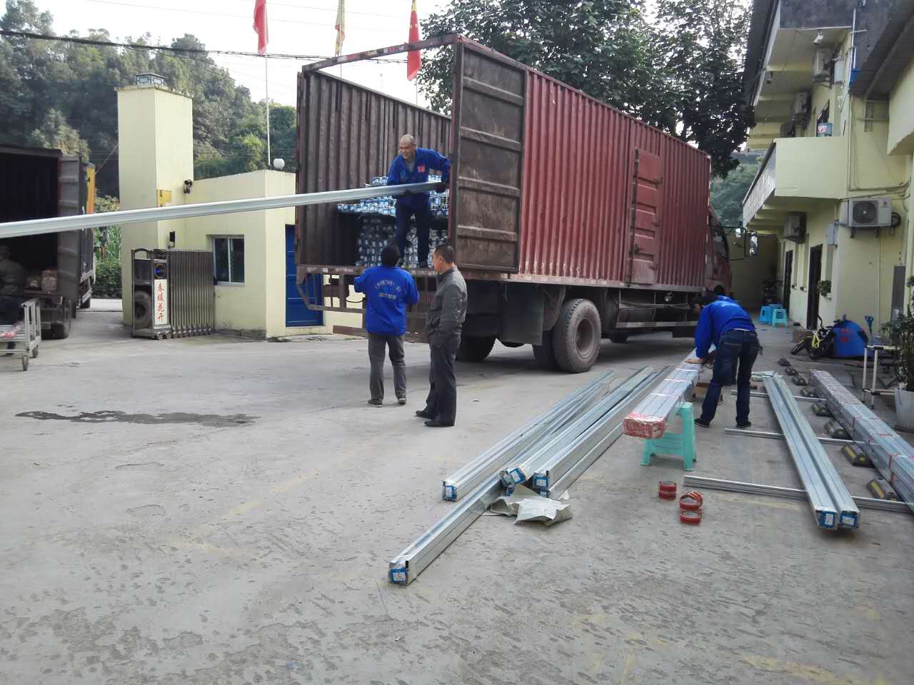 匯利興人呈接龍式搬運鋁型材同時鋁材打包出貨一并進(jìn)行