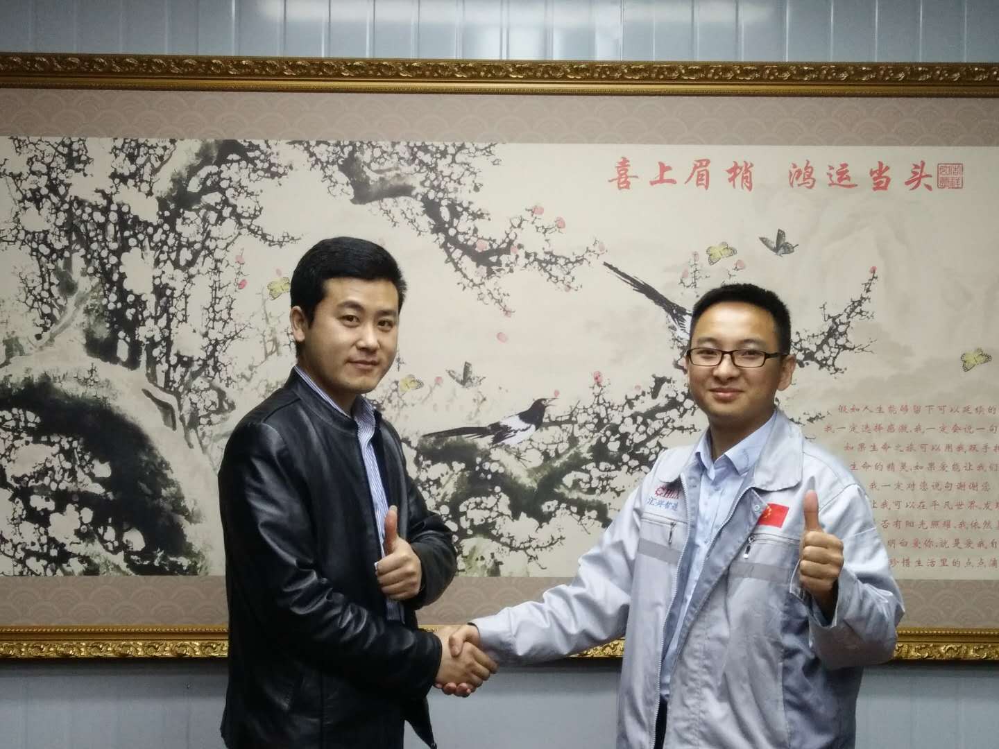 企業(yè)文化大使小敏正在為客人介紹匯利興文化 在此,客服部小敏(企業(yè)文化大使)為來訪的客人們相繼介紹了我司的企業(yè)文化,并帶領(lǐng)客人參觀了匯利興廠容廠貌,詳細(xì)介紹了匯利興的發(fā)展史及企業(yè)文化(三道:人道、孝道、商道,企業(yè)精神:用情做人、用心做事),并帶領(lǐng)客人初步了解了工業(yè)鋁型材、滾筒、精益管、工裝板、精密工業(yè)配件等材料的認(rèn)識,同時介紹了我司企業(yè)愿景:誓力打造中國自動化配件第一品牌,更好的滿足客戶個性化定制和柔性化生產(chǎn);此后對于匯利興濃厚的企業(yè)文化及厚重的企業(yè)實(shí)力,一致獲得了客人們高度的贊許及認(rèn)可并表示與匯利興合作十分放心。 客人與匯利興家人合影圖 客人為“喜上眉梢、鴻運(yùn)當(dāng)頭”錦上添花圖景 “相識滿天下,知心在匯興”,來訪客人受邀相繼在“喜上眉梢 鴻運(yùn)當(dāng)頭”留下深刻的印記,為此錦上添花?!坝36娭?,故源源而來”,相聚匯利興,故交友于匯利興同友人一起共發(fā)展共進(jìn)步。