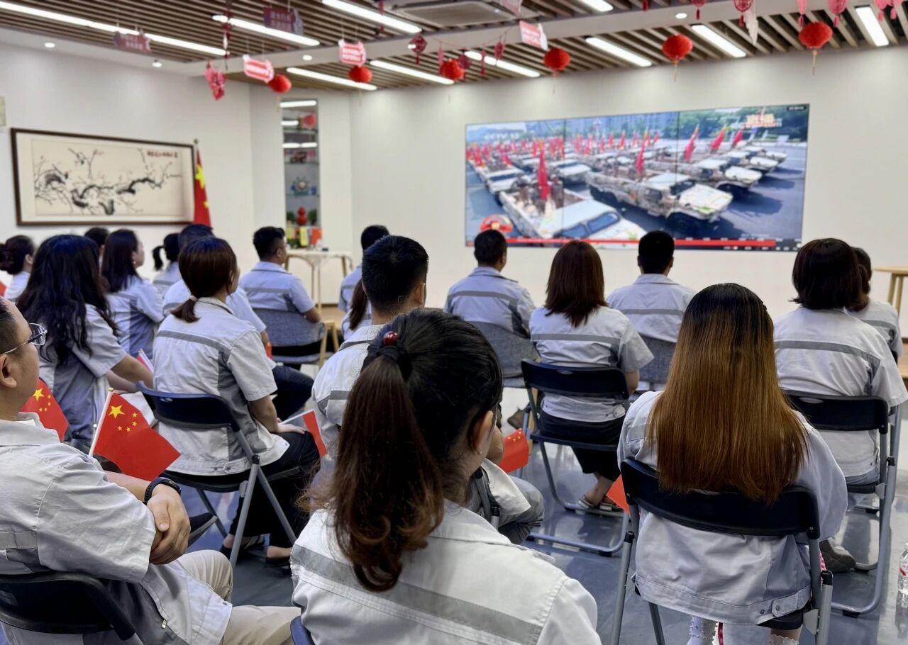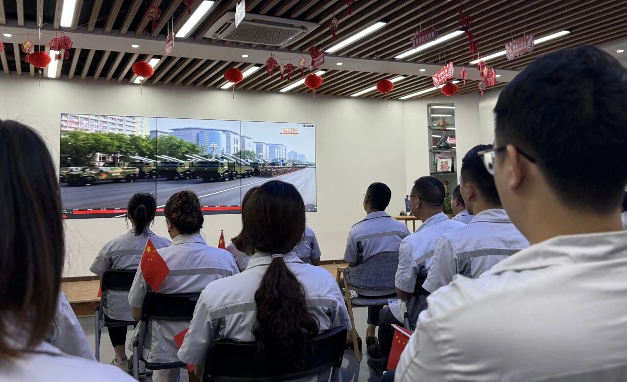 活動當日,整體氛圍莊重而肅穆,高清大屏提前調試就緒,員工們懷著崇敬與期待的心情提前入場就座。上午十時許,閱兵儀式正式拉開帷幕,踏地有聲的鏗鏘步伐,氣勢恢宏的莊嚴裝備,意氣風發的精神風貌、直擊人心的儀式場景,一幕幕畫面既讓在場員工深刻體悟到國家實力的強勁脈動與民族精神的昂揚姿態,更在思想層面引發深度共鳴。這場沉浸式體驗不僅是一次觸動靈魂的愛國主義教育,更成為企業文化注入家國情懷、實現精神賦能的鮮活范例!
