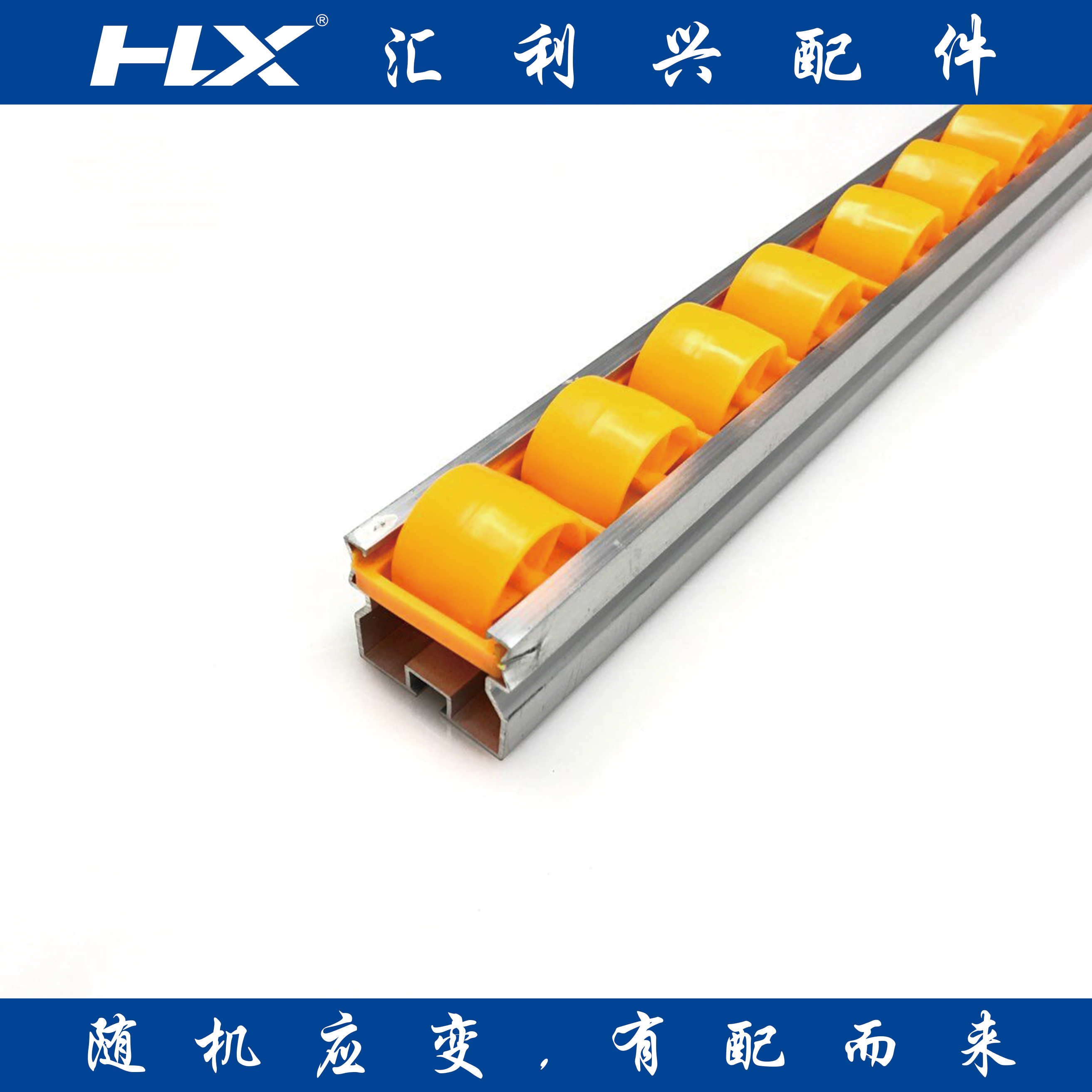 匯利興產品這流水線配件流利條系列,流利條主要用于輸送、倉儲系統配套產品,可用作滑軌、護欄、導向裝置、滾動性能好、成本低。滾輪采用高品質的熱塑性塑料制成,具有摩擦系數小、抗沖擊、壽命長、耐酸堿性、耐潮溫等優點。當貨物重量超過額定的負荷時,可在一個通道安裝多根流利條。安裝傾斜度取決于重量以及流利架的深度,一般3O~6O(5%~9%)。通常在深度方向上每隔600mm~800mm安裝一根支撐梁以增強流利條的剛度。滾輪顏色可選:黃色,藍色,白色,黑色等其他顏色。輪距常用為:35mm,45mm  并可以根據實際使用情況定尺生產。我司專業生產鋁全金流利條,載重流利條,板金流利條,鋁全金流利條接頭,板金流利條接頭等流水線配件。