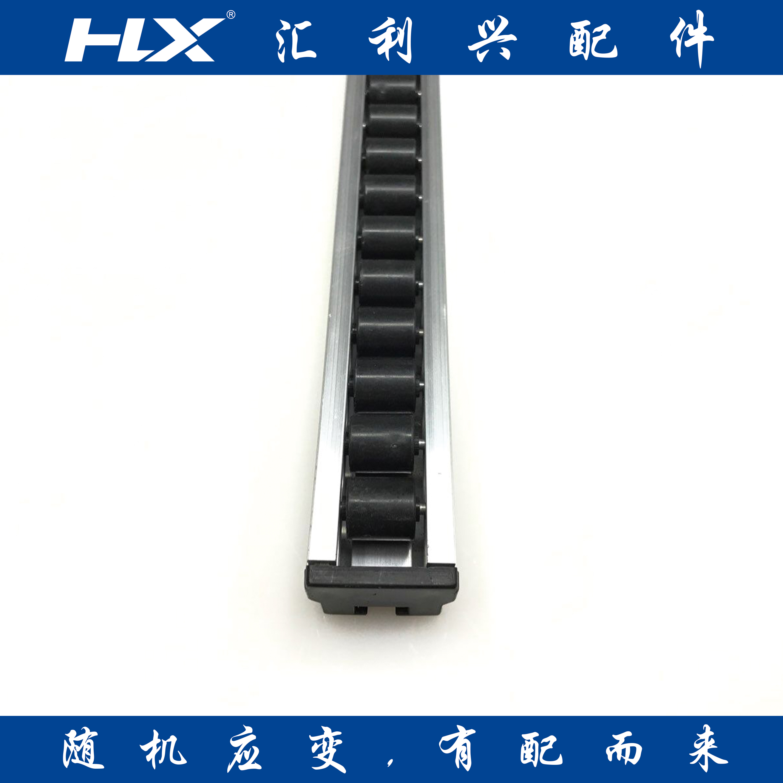 匯利興產品這流水線配件流利條系列,流利條主要用于輸送、倉儲系統配套產品,可用作滑軌、護欄、導向裝置、滾動性能好、成本低。滾輪采用高品質的熱塑性塑料制成,具有摩擦系數小、抗沖擊、壽命長、耐酸堿性、耐潮溫等優點。當貨物重量超過額定的負荷時,可在一個通道安裝多根流利條。安裝傾斜度取決于重量以及流利架的深度,一般3O~6O(5%~9%)。通常在深度方向上每隔600mm~800mm安裝一根支撐梁以增強流利條的剛度。滾輪顏色可選:黃色,藍色,白色,黑色等其他顏色。輪距常用為:35mm,45mm  并可以根據實際使用情況定尺生產。我司專業生產鋁全金流利條,載重流利條,板金流利條,鋁全金流利條接頭,板金流利條接頭等流水線配件。