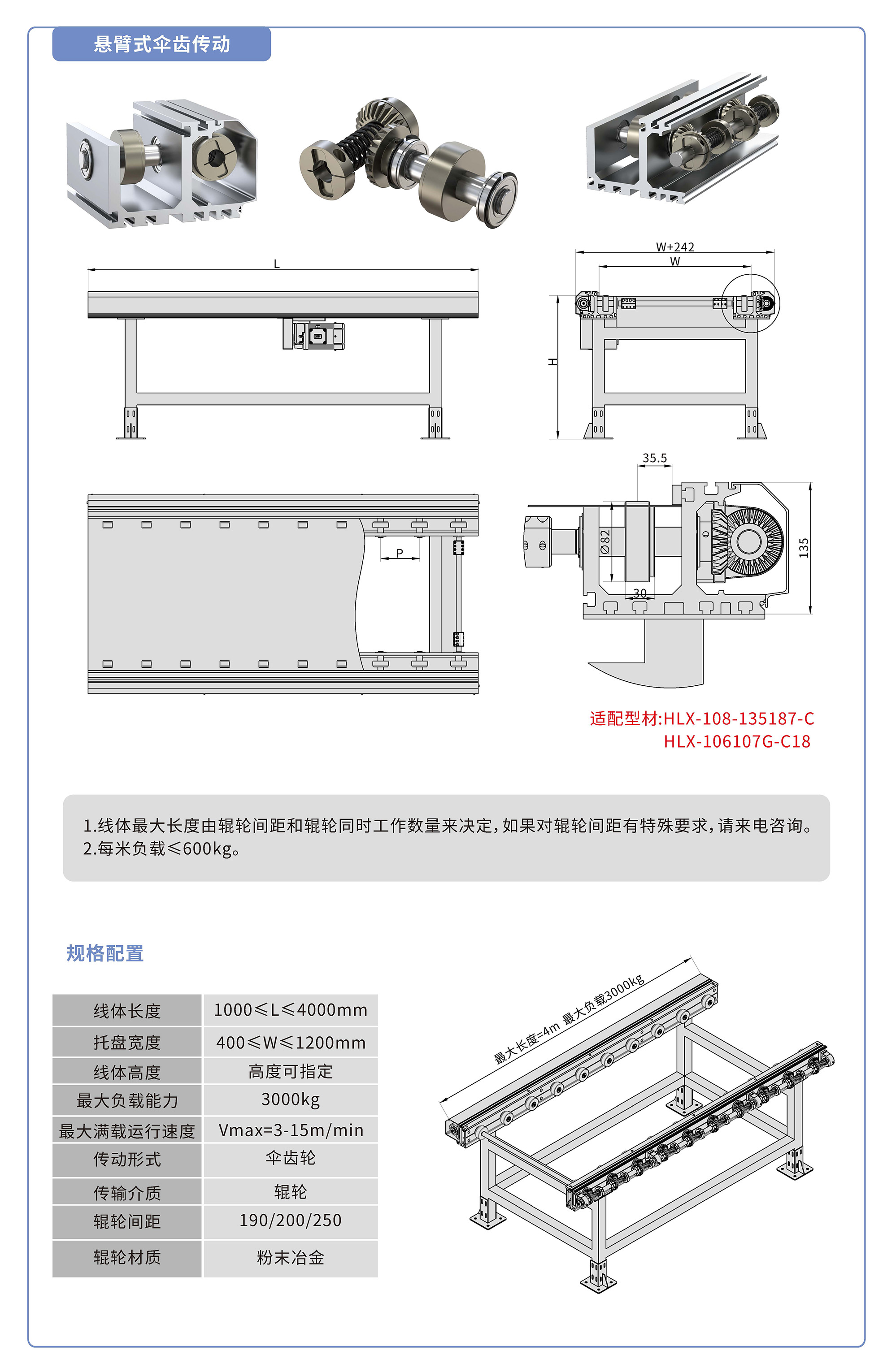 采用135187鋁型材,傘齒驅(qū)動(dòng),粉末冶金滾輪鑲嵌銅套實(shí)現(xiàn)積放功能,負(fù)載3000kg/米,最大負(fù)載速度15M/min, 輪距190、200、250可選,適用托盤寬度400-1200mm,線體長度范圍1000-4000mm, 高度根據(jù)需求定制.